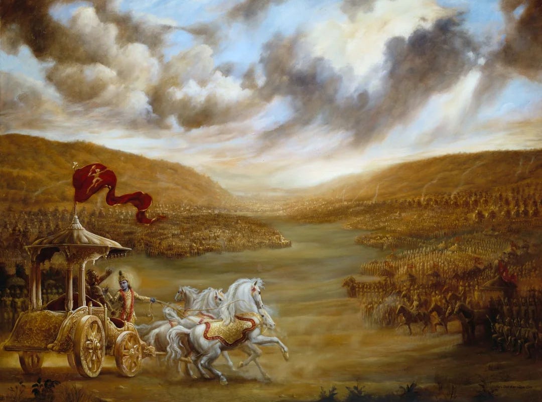 Thousands of years before Baudrillard wrote that, and thousands of miles away, on a battlefield in Jyotisar, Krishna spoke to Arjun: “It is better to strive in one’s own dharma than to succeed in the dharma of another.” If I was to rediscover my purpose, my dharma, it had to be my own. Once again, I’m sitting on the carpeted floor of the old community center with my friends, seeking clarity in ancient wisdom.
